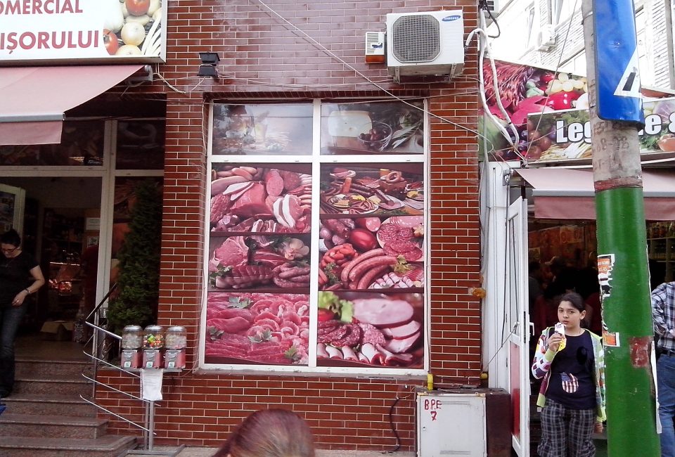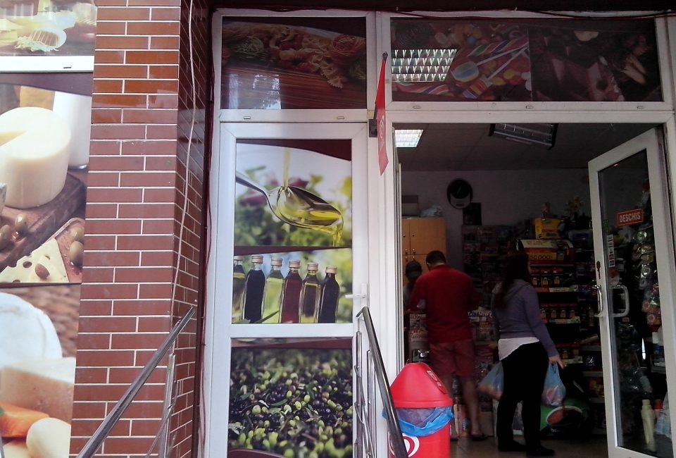 Colantam geamuri si vitrine spatii comerciale. Autocolantul este laminat, rezistent la apa si se poate spala. Inscriptionarea se poate face cu autocolant printat sau cutting(decupat computerizat). Autocolantul decupat computerizat nu necesita laminare , fiind colorat in masa.